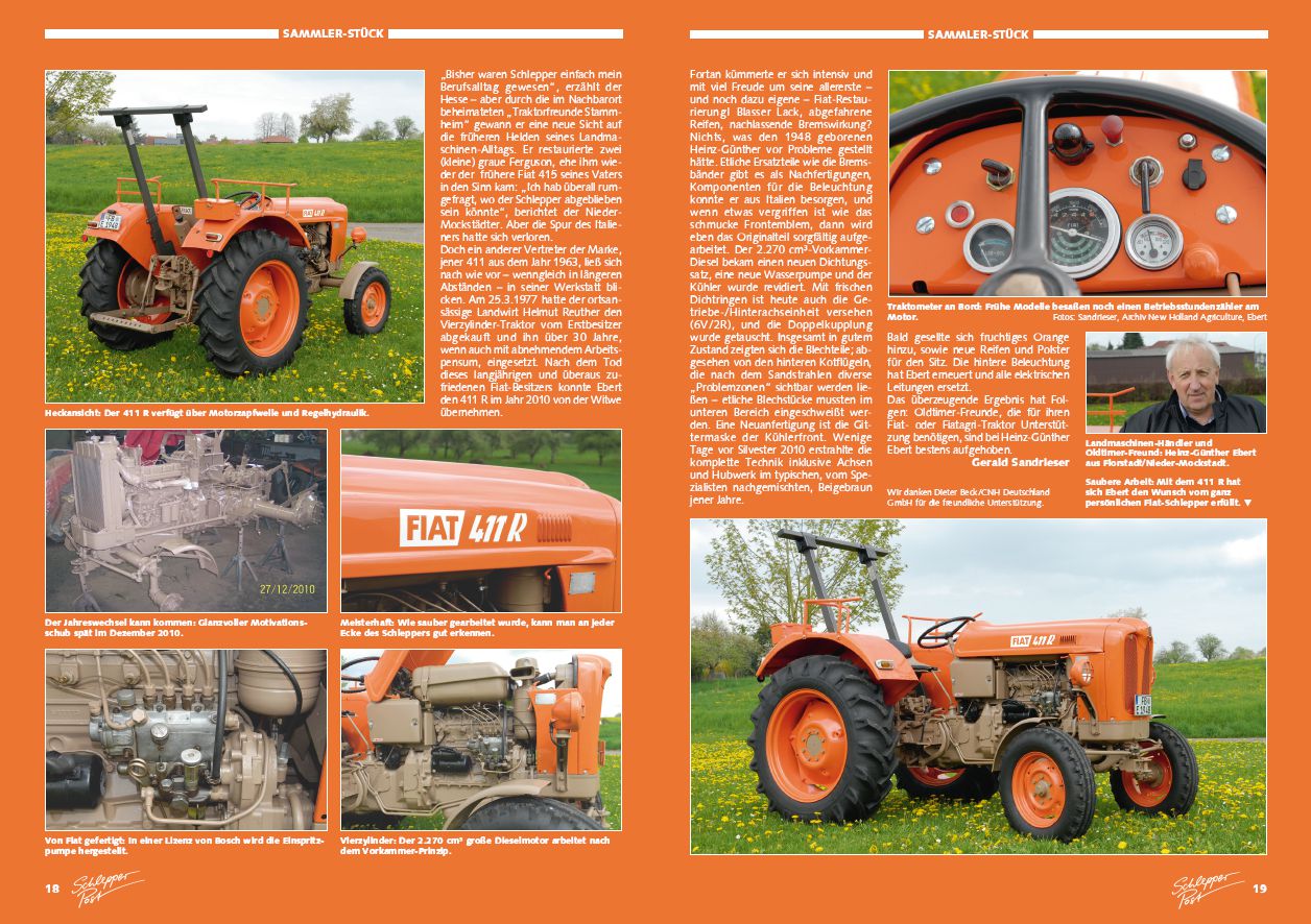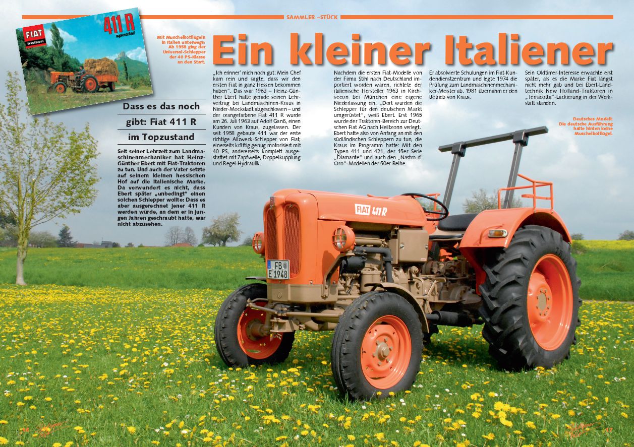 „Ich erinn’r mich noch gut: Mein Chef kam rein und sagte, dass wir den ersten Fiat in ganz Hessen bekommen haben“. Das war 1963 – Heinz-Günther Ebert hatte gerade seinen Lehrvertrag bei Landmaschinen-Kraus in Nieder-Mockstadt abgeschlossen – und der orangefarbene Fiat 411 R wurde am 26. Juli 1963 auf Adolf Ganß, einen Kunden von Kraus, zugelassen. Der seit 1958 gebaute 411 R war der erste richtige Allzweck-Schlepper von Fiat; einerseits kräftig genug motorisiert mit 40 PS, andererseits komplett ausgestattet mit Zapfwelle, Doppelkupplung und Regel-Hydraulik.